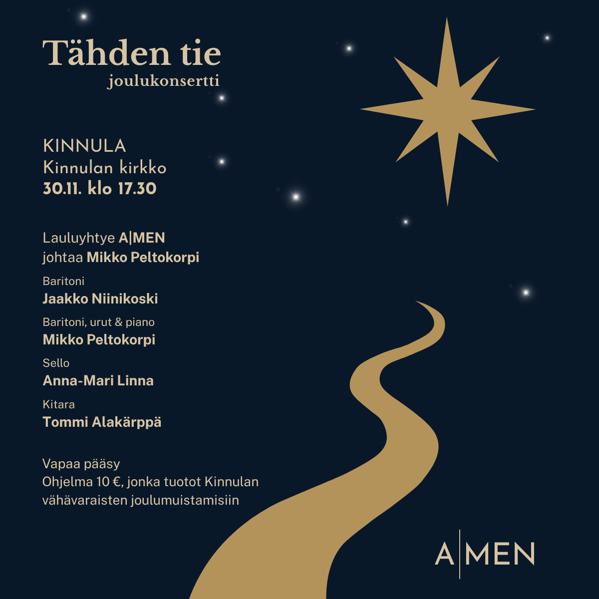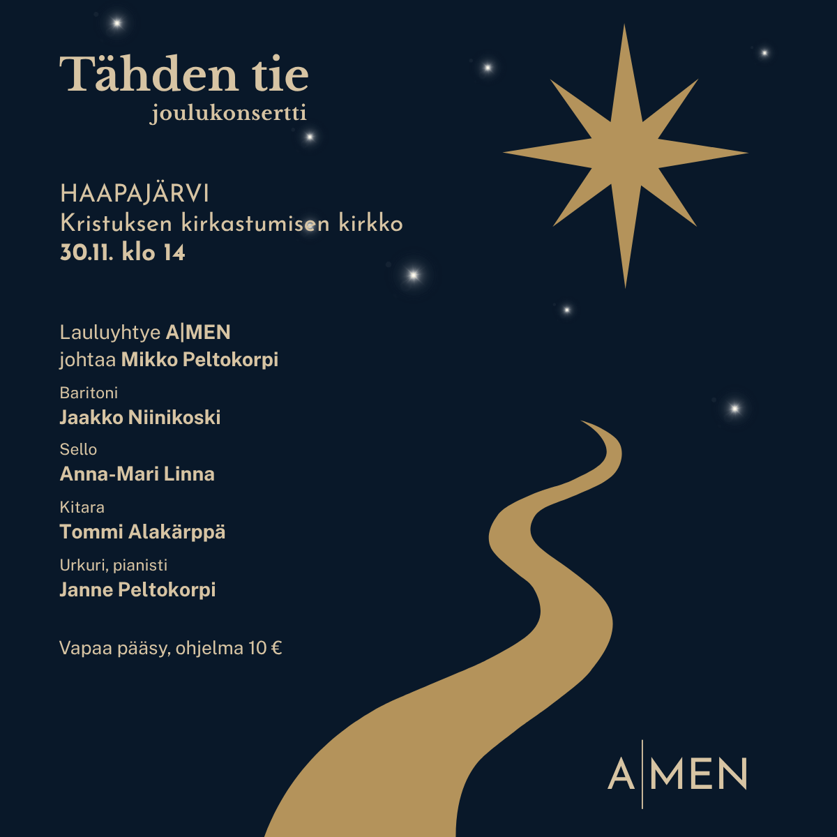Kutsumme kuulijamme nauttimaan adventin ja joulun ajan musiikista Tähden tie -konserttikiertueellemme. Ohjelmisto kuljettaa kuulijan paimenten matkasta Betlehemin yöhön ja kohti joulun ydinsanomaa. Kuoroa johtaa Mikko Peltokorpi. Jokaisessa konsertissa on myös vierailevia taiteilijoita, sekä yhteislaulua.